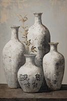 Een sfeervol stilleven waarin keramiek centraal staat. De subtiele lichtval benadrukt de zachte vormen en texturen van de objecten, waardoor een serene en tijdloze uitstraling ontstaat. De ingetogen kleuren en delicate compositie zorgen voor een harmonieus beeld dat rust en eenvoud uitstraalt. Dit werk brengt een gevoel van ambacht en traditie in huis en past prachtig in een interieur waar subtiliteit en elegantie gewaardeerd worden.