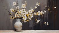 Olieverfschilderij van een stilleven van een vaas met kersenbloesem in de kleurstelling geel, wit, bruin, grijs en petrol op een houten tafel. De bloem staan in een aardenwerk vaas. Grove palletmesstreken op de achtergrond. Passend bij diverse stijlen en trends.