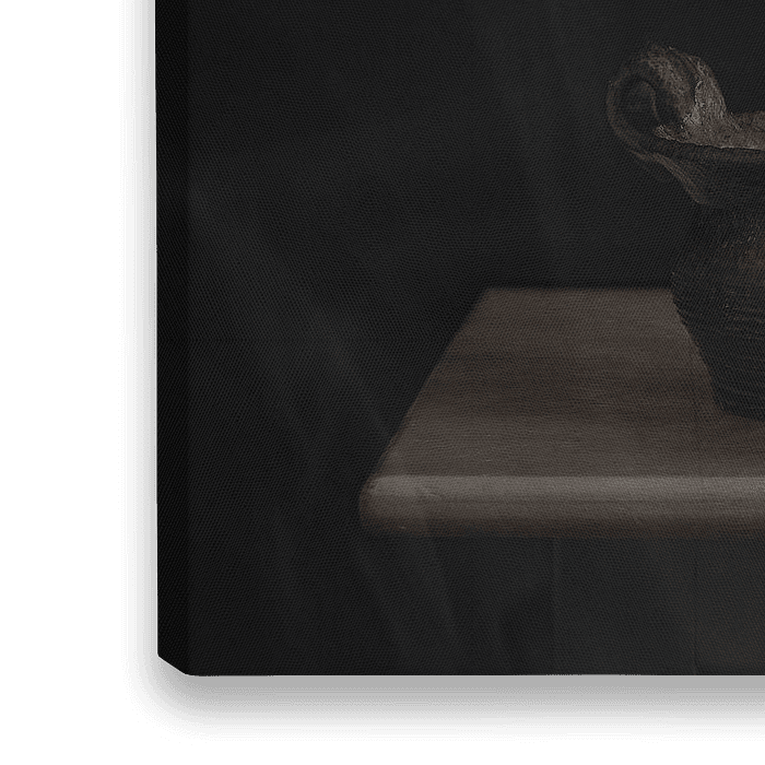 Stilleven in de keuken met vaas, kom, uien en pruimen. omgeven met rook. Een stilleven aan uw wand in de keuken of gewoon in de woonkamer is een sieraad voor uw woning