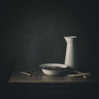 Eenvoud, een geëmailleerde kom, bonen en kruik op een houten tafel.