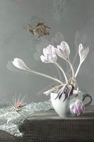 Stilleven verticale vergrijsde foto van een theekopje met daarin een knolletje met bloemen samen met bubbeltjes plastic met daarop een sierlijk sprietig plantje dat net als het knolletje leeft van licht en lucht. Geen water of voeding nodig. Een herfstblad zweeft in de lucht aan een ijzerdraadje. Alles op een vergrijsd tafelblad tegen een grijze achtergrond.