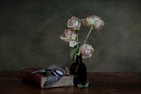 Stilleven in de stijl van de oude meesters met oude boeken, verdorde bloemen en een dood vogeltje.