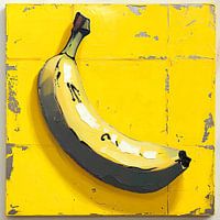 Dit kunstwerk presenteert een eenvoudige banaan tegen een monochrome gele achtergrond, waarbij het onderwerp opvalt door zijn realistische weergave te midden van de abstracte omgeving.