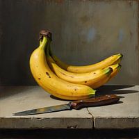 Het stilleven wordt gekarakteriseerd door de ingetogen sfeer, waar de verfijnde details van de bananen en het mes samenkomen in een moment van rust, temidden van de harde, koele omgeving van de muur.