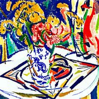 Stilleven met Delftse vaas - een abstract werk vol vreugde, zomer en lichtheid. Geniet van digitale kunstwerken en illustraties. Handgeschilderde natuurlandschappen en abstracte werken op doek en nog veel meer.