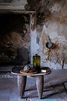 Een stilleven gefotografeerd in een vervallen Franse boerderij. De kleuren en vormen harmoniëren mooi met de modern gedekte bijzettafel.