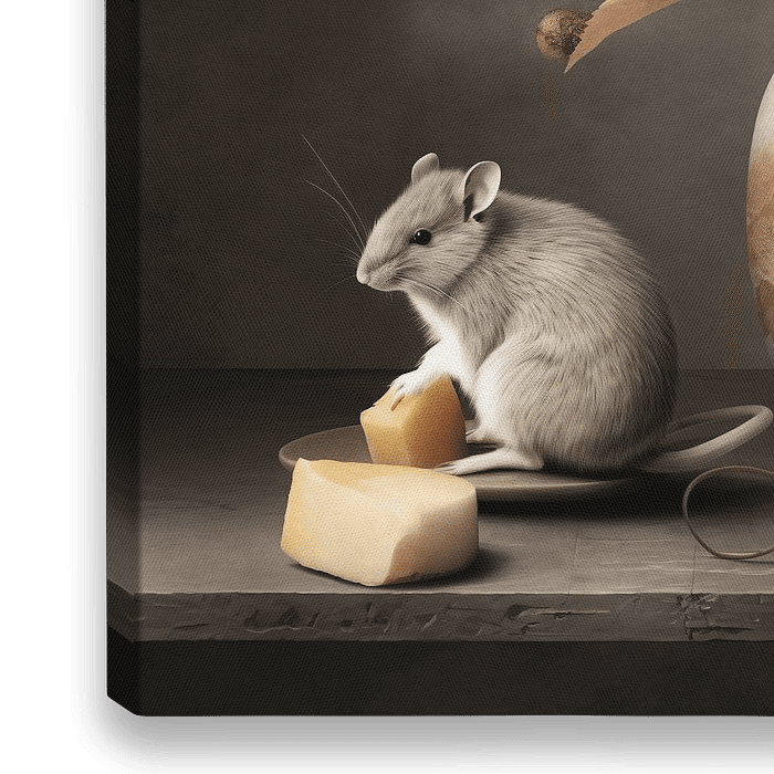 Stilleven met een muisje met kaas en een vaas met droogbloemen.