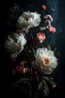 Een meesterlijk stilleven in renaissance stijl, waar weelderige witte pioenrozen en delicate roze rozen baden in mysterieus strijklicht tegen een donkere achtergrond. De compositie ademt de sfeer van een klassiek Nederlands meesterwerk, waarbij subtiele rookeffecten en de dramatische lichtval de bloemen een bijna etherische uitstraling geven.