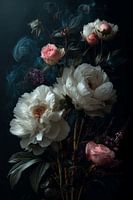 Een dramatisch stilleven dat de tijdloze schoonheid van witte pioenrozen en zachtroze rozen vangt tegen een diepdonkere achtergrond. De delicate bloemen lijken te zweven in een mysterieuze atmosfeer, waar subtiele rookwolken een etherische sfeer creëren. Het contrast tussen de zachte, lichte bloemen en de duistere omgeving creëert een bijna barokke uitstraling die doet denken aan de Nederlandse meesters.