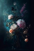 Een hedendaagse interpretatie van een klassiek bloemstilleven waar rozen en pioenrozen centraal staan tegen een diep turquoise achtergrond. De dramatische belichting en mysterieuze rook creëren een sfeervolle compositie die het klassieke genre naar het heden vertaalt. De delicate bloemen lijken te zweven in de donkere ruimte, waarbij zachte roze tinten contrasteren met de intense achtergrondkleur.