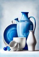 Dit prachtige stilleven is samengesteld uit diverse vazen met wit en blauw glazuur. De zachte kleuren van het glazuur doen fris en rustgevend aan, en roepen direct de sfeer van een ontspannen strandvakantie op. Het stilleven heeft dan ook een heerlijke Ibiza vibe.