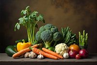 Een rijk en rustgevend stilleven van verse groenten in warme tonen. Van knapperige wortels tot volle broccoli en romige bloemkool – perfect voor een landelijke keuken, groenteliefhebbers of culinaire sfeerhoek.