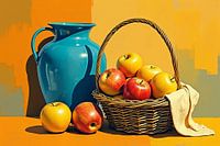 Deze fascinerende muurschildering geeft een eigentijdse draai aan de traditionele stillevenschilderkunst. De appelmand, centraal geplaatst in de compositie, straalt een harmonieuze energie uit door de levendige kleuren en fascinerende texturen. De artistieke realisatie combineert duidelijke geometrische vormen met vloeiende lijnen, waardoor een spannende wisselwerking tussen natuur en abstractie ontstaat. De appels, in verschillende tinten, symboliseren frisheid en overvloed en nodigen de kijker uit om na te denken over het contrast tussen alledaagse voorwerpen en hun artistieke representatie. Dit moderne stilleven brengt zowel kleurrijk plezier als diepte in elke kamer.
