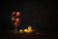 Warm stilleven met citroenen en appels. Brengt een kunstzinnige sfeer in uw kamer met een warme gloed. ook leuk als ronde foto of muur behang.