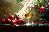 Voeg een vleugje klassieke elegantie toe aan je interieur met dit prachtige stilleven. Dit kunstwerk toont een harmonieuze compositie van levendige rode appels en een glinsterend wijnglas, geplaatst in een sfeervol spel van licht en schaduw. Omringd door zachte tinten groen en roze van bloeiende rozen, straalt het schilderij warmte en verfijning uit. Perfect voor in de woonkamer, eetkamer of keuken, deze print brengt een tijdloze schoonheid in elke ruimte. Laat je inspireren door de gedetailleerde texturen en rijke kleuren die dit werk tot leven brengen en je interieur verrijken.