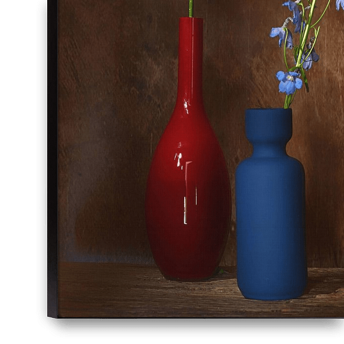 Stilleven met blauw en rood en geel. Past in iedere ruimte en geeft het een frisse, warme touch .