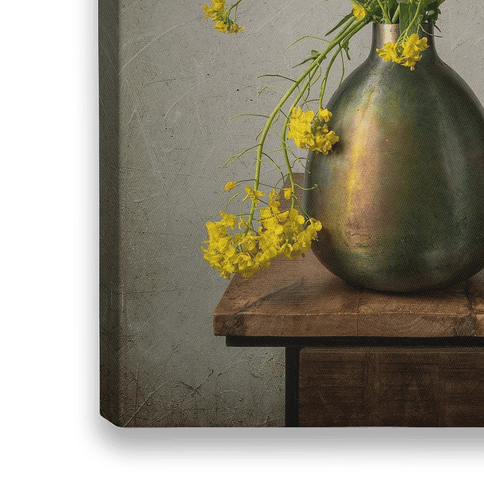 De kruik heeft een mooi patina van brons en de kleuren gaan goed samen met het geel.