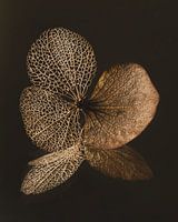 "Stilleven met bloemen: Het hortensiablaadje" is een macrofoto van een blaadje van de hortensia die al deels vergaan is, waardoor je prachtig de nervenstructuur kan zien van het blad. Als je inzoomt op het werk zie je dat 2 blaadjes alleen nog maar een nerven structuur hebben en het derde blad is heel fragiel en dun, waardoor je ook de nerven mooi kunt zien.