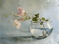 Stilleven met bloemen, Japandi stijl. Een bijzonder stilleven met roze bloemen in zachte pastelkleuren in een serene en poëtische sfeer. Een prachtig werk voor je wand!