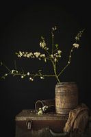 Aan de hand van enkele houten potten, een oud gemaakte lap, een verweerde koffer als ondergrond, heb ik dit stilleven samen gesteld.