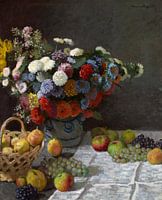 Hoewel geschilderd in zijn atelier, toont dit stilleven de invloed van de buitenexperimenten die Claude Monet in de zomer en herfst van 1869 ondernam, terwijl hij in Bougival aan de Seine woonde. Zijn oefeningen in verschillende schildertechnieken zijn terug te vinden in de manier waarop hij de contouren van vormen verzachtte en de manier waarop hij de beschrijvende mogelijkheden van penseelstreken verkende: breed en plat in het tafelkleed, schetsmatig in de appels en kort en dicht in de bloemblaadjes. Monet's techniek komt ook tot uiting in het gebruik van licht om het oppervlak van de bloemen, vruchten en tafelkleed te animeren en in de manier waarop de kleuren worden beïnvloed door het licht, door reflecties en door elkaar. Deze picturale innovaties werden de basis voor de ontwikkeling van de impressionistische techniek in de decennia daarna.