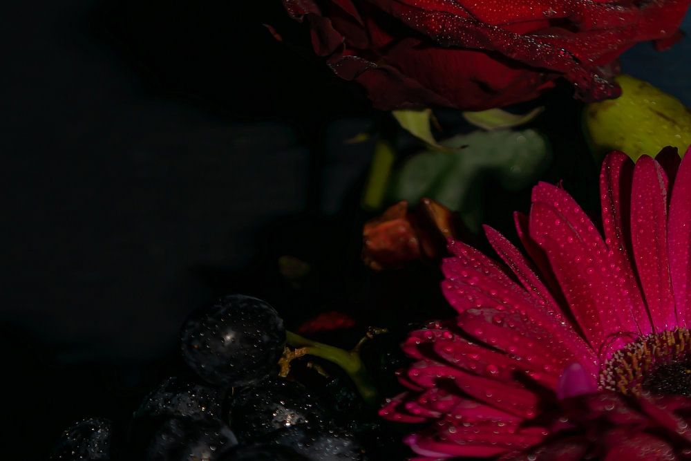 Stilleven met bloemen (rozen) en fruit (druiven) tegen donkere achtergrond (low key)