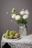 Stilleven met pioenrozen en fruit. Gemaakt in wit en grijstinten en belicht door studiolampen.