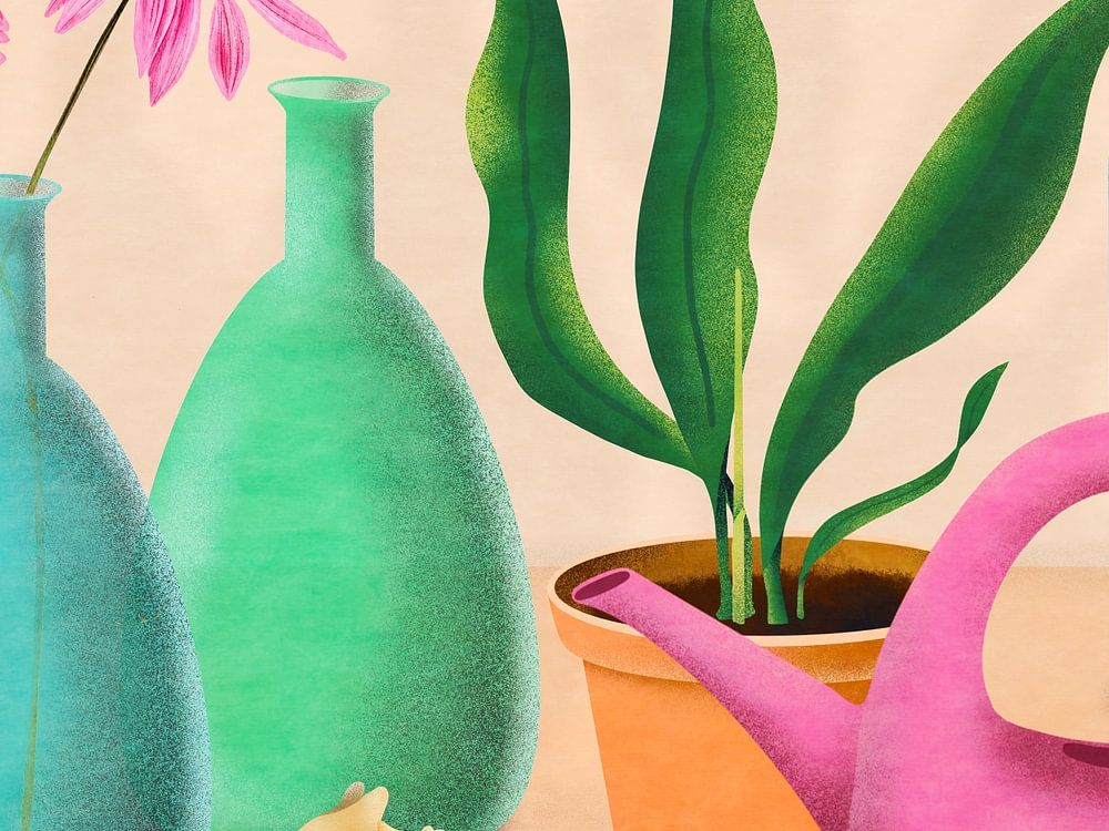 Dit stilleven is digitaal getekend op de iPad. De flessen, kamerplant, bloemen, gieter en schelp worden in een vereenvoudigde stijl weergegeven. Een zonnige afbeelding die rust maar ook kleur in het interieur brengt.