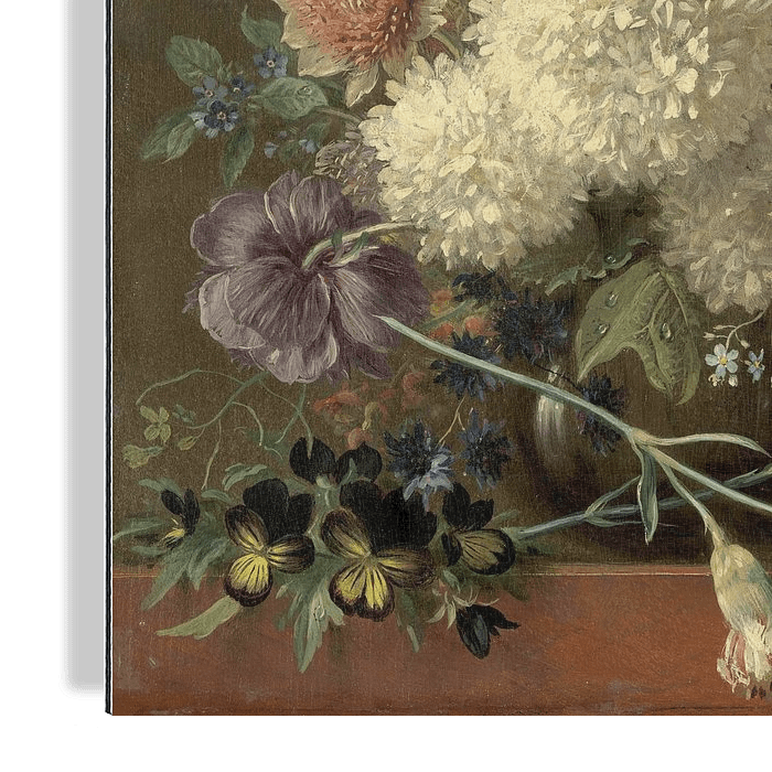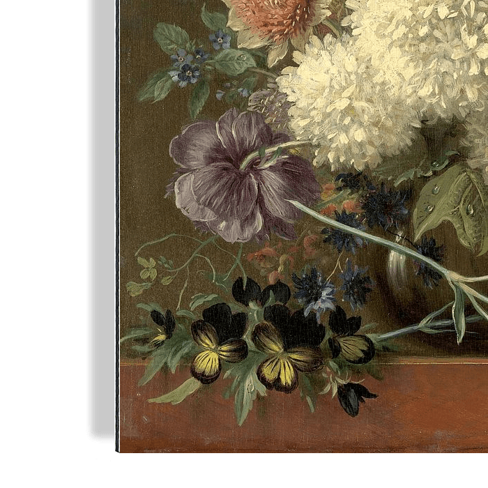 Stilleven met bloemen in een vaas van Georgius Jacobus Johannes van Os. Geschilderd omstreeks 1850. Op deze afbeelding vind je een combinatie van bloemen zoals anjers, viooltjes en dahlia's. Bij elkaar een kleurrijk geheel!