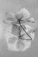 "Stilleven met bloemen in zwart-wit : Het hortensiablaadje in het licht" is een macrofoto van een blaadje van de hortensia die al deels vergaan is, waardoor je prachtig de nervenstructuur kan zien van het blad. Als je inzoomt op het werk zie je bij de bovenste twee blaadjes de nerven structuur goed. De blaadjes zijn heel fragiel en dun, waardoor je ook de nerven er mooi uitkomen.