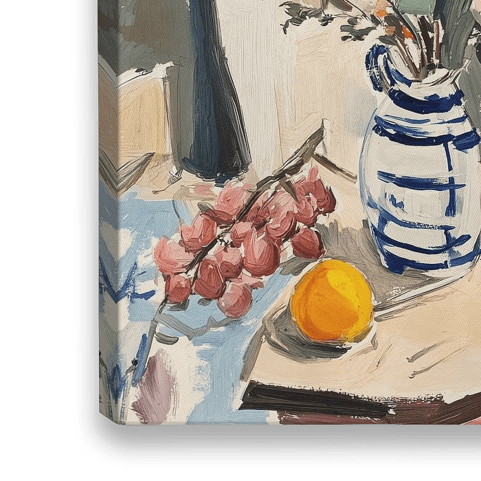 Stilleven met bloemen in een blauw-wit gestreepte vaas, op een tafel bij het raam, met druiven en sinaasappels. Penseelstreken, olieverfschilderij, met roze en gele accenten en felle kleuren, in het interieur van een oude Franse flat.