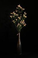 Stilleven met kleurrijke bloemen in een vaas die mooi kleurverloop geeft naar de donkere achtergrond.