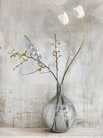Stilleven met een vaas en een tak bloesem en twee witte tulpen in Japandi stijl.