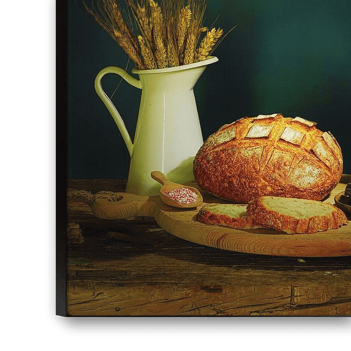 Een uitnodigend en sfeervol stilleven met brood dampenden koffie en chocolade en korenaren.