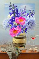 Grote oude pot van Petrus Régout met daarin pioenroos chrysant en Delphinium, staand op een houten tafel met daarbij een lichte linnen doek, struisveren maorischelpen en eenkristqllen glaasje met oranje likeur. Tegen een achtergrond waarin je elementen ziet van de Hollandse zee, omkaderd door de werkelijke lichte achtergrond. Een…