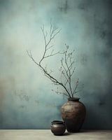 Stilleven met een tak in een vaas "nieuw landelijk". Tegen een lichtblauwe achtergrond. Thema's: zen wabi-sabi minimalisme. Kies zelf het formaat en materiaal en maak het passend voor jouw interieur. Digital art.