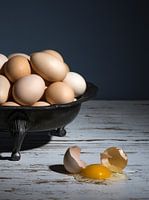 Stilleven met een tinnen schaal met een stapel eieren en een gebroken ei op een witte tafel met een blauwe achtergrond