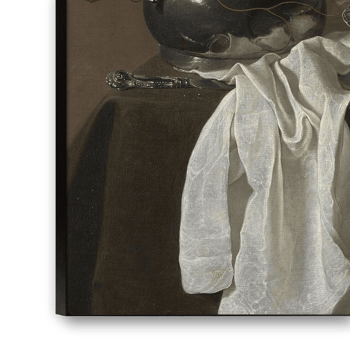 Hier heeft Jan Jansz. Treck de uitdaging aan om de glans en de vervormde reflecties in zilver, tin, glas, porselein en eierschalen op te roepen, evenals de complexe schaduwen in een verfrommeld linnen doek. Het was een zeer gewaardeerde vaardigheid in de Nederlandse stillevenschilderkunst en dit tamelijk fraaie voorbeeld van het genre heeft een bijzonder rustige esthetiek.
