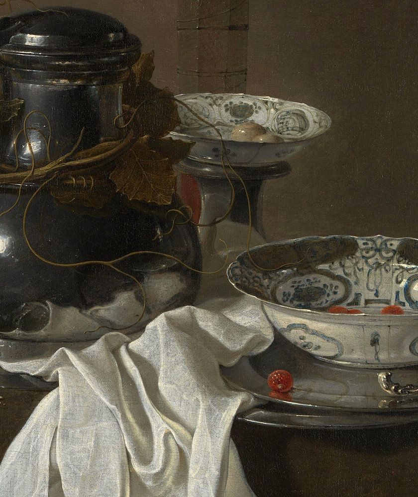 Het algemene kleurenschema is gedempt, gedomineerd door grijzen, groenen en bruinen - alleen de felrode bessen springen in het oog. Voor onze ogen lijkt de selectie van voorwerpen ook nogal alledaags: het is de nasleep van een maaltijd, waar de borden, schalen en een kan tijdelijk aan de kant zijn geschoven, samen met een weggegooid servet. Maar de twee blauw-witte schotels zijn geen normaal huishoudelijk vaatwerk. Het is zeer duur Chinees porselein uit de late Ming-periode. Dit waren exotische en zeer begeerlijke goederen, en dit schilderij is een feest van luxe.