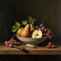 Het schilderij toont een eenvoudig stilleven: een schaal met vruchten op een houten wandplank. Op de schaal ligt een doorgesneden stuk fruit, het zachte vruchtvlees blootgelegd, met ernaast een oud mes. De donkere achtergrond versterkt het spel van licht en schaduw, waardoor een ingetogen, tijdloze sfeer ontstaat.
