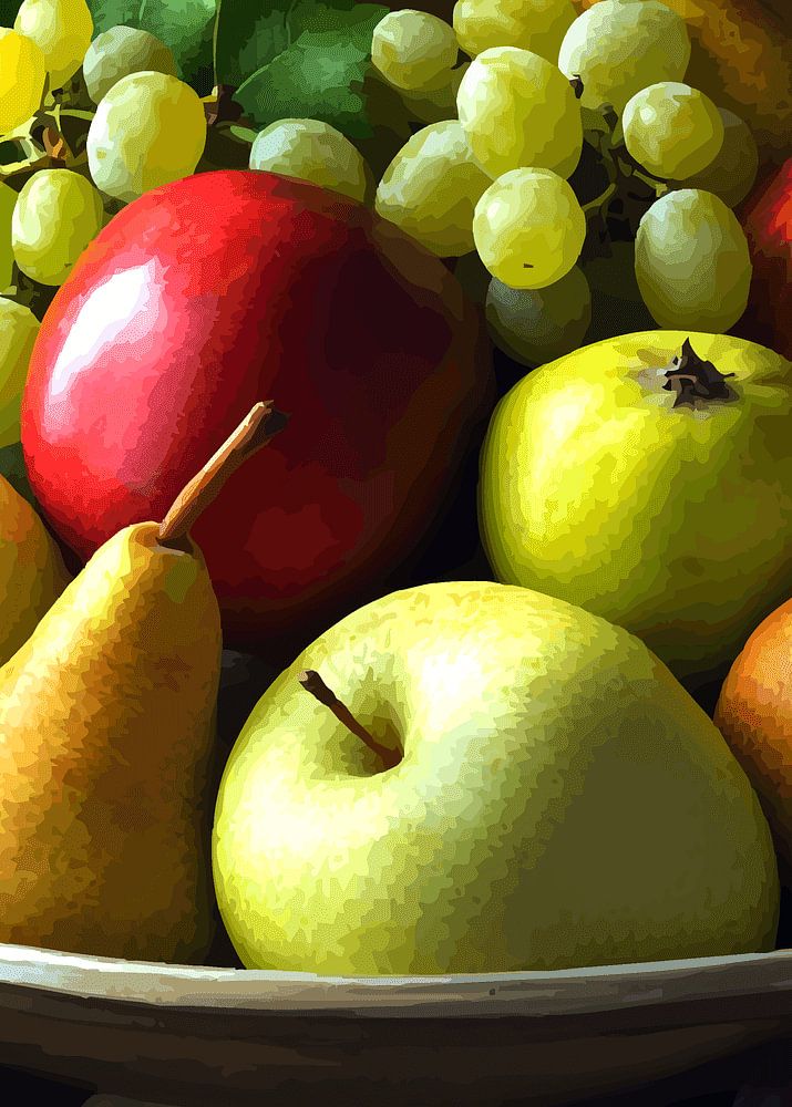 Dit gedetailleerde stilleven toont een rijk gevulde fruitschaal met sappige appels, peren en druiven, die oplichten in een warm licht. Het harmonieuze kleurenpalet van rood, groen en geel geeft het motief een tijdloze elegantie. De zachte schaduwen en donkere achtergrond benadrukken het heldere fruit en creëren een klassieke compositie die doet denken aan de meesterwerken van de oude schilderkunst. Een esthetische en stijlvolle afbeelding voor liefhebbers van klassieke kunst.
