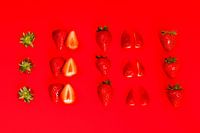 Stilleven met gesneden aardbeien op rode achtergrond.