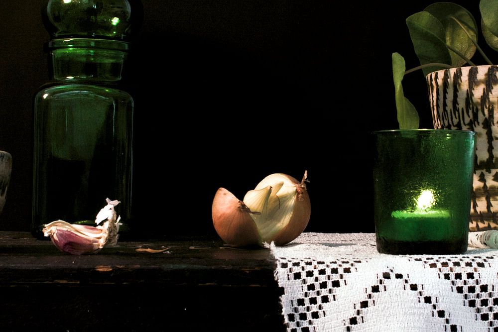 Stilleven met groene retro spulletjes en pannenkoekenplantje.