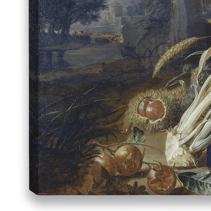 Koop Stilleven met groenten en fruit voor een tuinbalustrade, Cornelis de Heem als reproductie geprint op canvas, aluminium dibond, (ingelijste) fotoprint, behang en ArtFrame. Voor jou op maat geprint in Fine-Art kwaliteit.