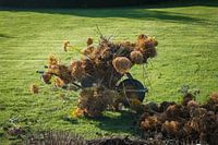Kruiwagen volgeladen met uitgebloeide hortensia bloemen in de herfst, samen een mooi stilleven met herfst elementen.