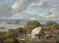 Stilleven met inktvissen, schol, kabeljauw, mosselen en andere vissen op een duin, een kerk aan de overkant van een riviermond, Jan van Kessel.