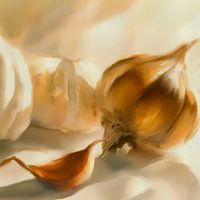 In dit verstilde schilderij speelt de knoflook de hoofdrol. Een heerlijke close-up, perfect voor in de keuken. Om jou te inspireren om zelf de heerlijkste gerechten te maken. En om lekker te kunnen koken, vind ik knoflook toch wel een onmisbaar kruid. Vooral in de Franse keuken, mediterraanse keuken en midden-europese keuken. Daarnaast is de knoflook ook nog eens ontzettend gezond, omdat het cholesterol- en bloeddrukverlagend zou werken. Maar bovenal, is het kruid gewoon een ontzettende smaakmaker. Onmisbaar in de keuken.