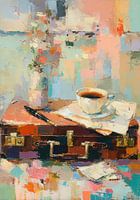 Een impressionistisch stilleven toont een bruine koffer met metalen handvatten, een wit koffiekopje op een lichtgekleurde achtergrond en een zwarte pen die er schuin bovenop ligt. Links staat een gedeeltelijk bedekte witte vaas met bloemen in roze, oranje en wit. De achtergrond is abstract met zichtbare penseelstreken in blauwe, roze en…