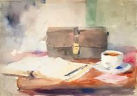 Een impressionistische aquarel toont een stilleven met een bruine leren tas, een open notitieboek en een koffie op een rode stoffen ondergrond. De tas is iets open en heeft een gouden gesp, het notitieboekje ligt iets schuin en er ligt een zwarte pen schuin bovenop. De koffiekop op een wit schoteltje maakt de compositie compleet. De…