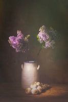 Dromerig stilleven met lila seringen met knoflook streng. Door zijn ingetogen sfeer makkelijk inpasbaar.